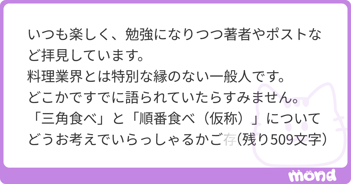 いつも楽しく、勉強になりつつ著者やポストなど拝見しています。 料理業界とは特別な縁のない一般人です。 どこかですでに語られていたらすみません。 「三角食べ」と「順番食べ(仮称)」についてどうお考えでいらっしゃるかご存知のことなど合わせて伺ってみたいです! 私は色んなもの… | mond
