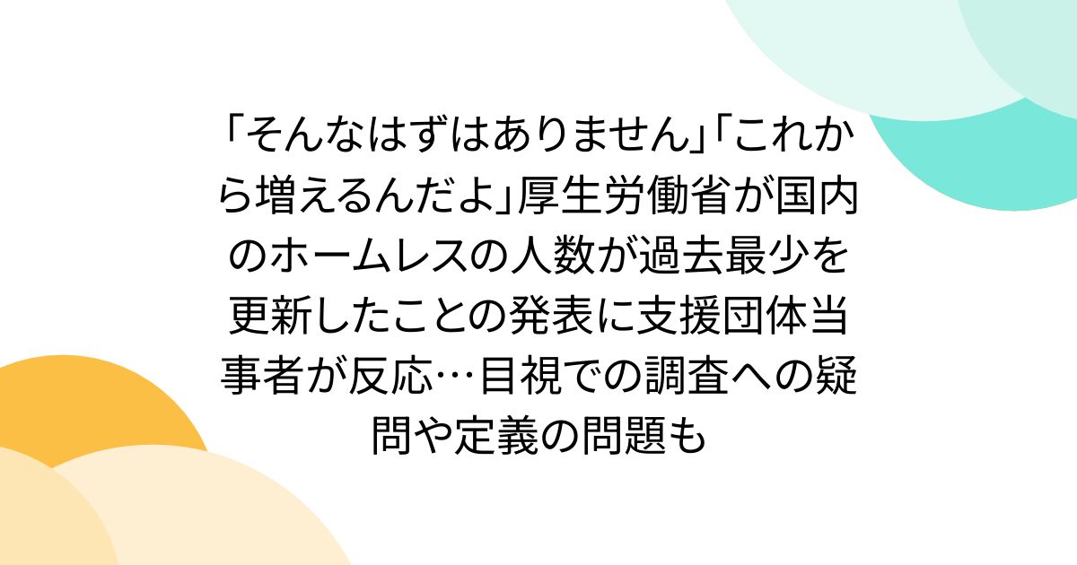 「これ草生えるわ。東京都のホームレス507人って発表やけど、NPO2団体だけで年間500人以上相談受けとるやんけ。算数できんのか厚労省は。」